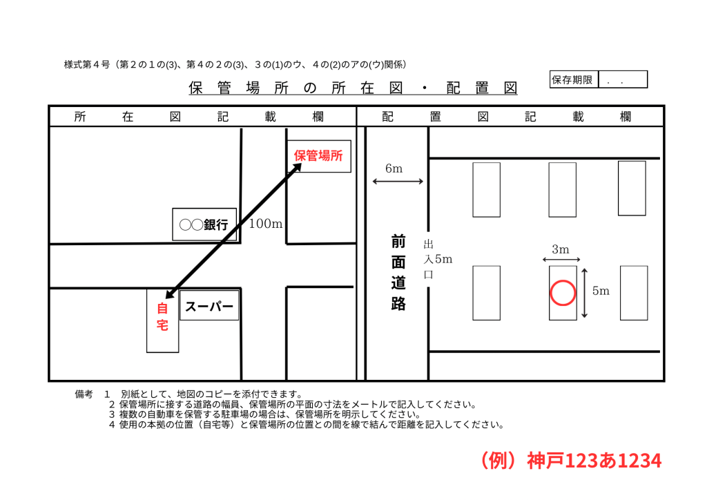 まず、「所在図・配置図」のうちの「配置図」とは、ご自身の自動車を保管する駐車スペースの具体的な場所や寸法を示すための図面です。警察署は、まずこの図面を見て、申請された場所に自動車が問題なく駐車できるかを確認します。