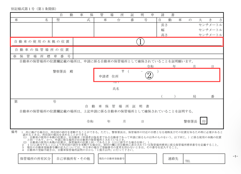 通常、❶の「自動車の使用の本拠の位置」と❷の「申請者住所」は一致します。