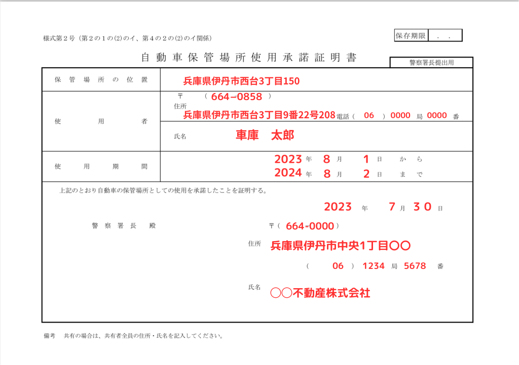 「使用期間」…車庫証明の申請日時点で使用期間が到来している必要があります。例えば、この承諾書見本で7月30日に警察署に申請に行っても、あくまで使用開始は「8月1日」からですので、警察は受理してくれませんので注意しましょう。