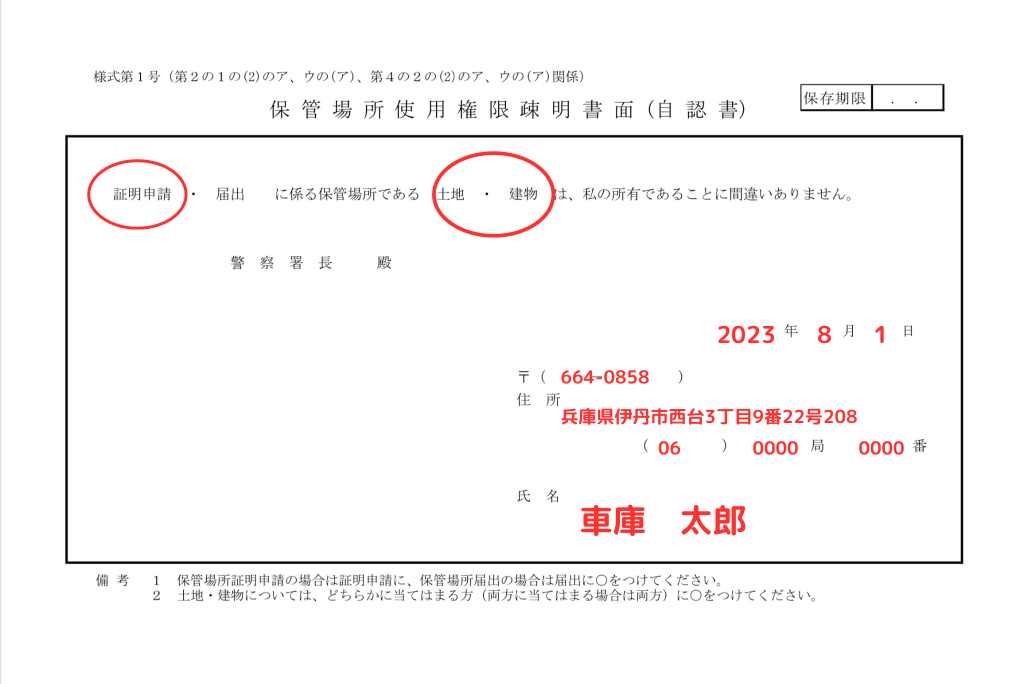 (保管場所が自己の所有である場合)自認書